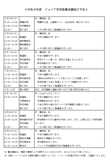 | 応募条件 | ①4月から中学校、義務教育学校(7年生以上)、高等学校、中等教育学校、特別支援学校(中等部・高等部)、高等専門学校(3年生以下)の在籍者であること ②応募するにあたり、保護者の同意が得られ、各自で当館までの来館手段が確保できること ③計7回の養成講座を受講し、地学・植物・動物分野に関する自由研究を行い、その成果等を発表できること |